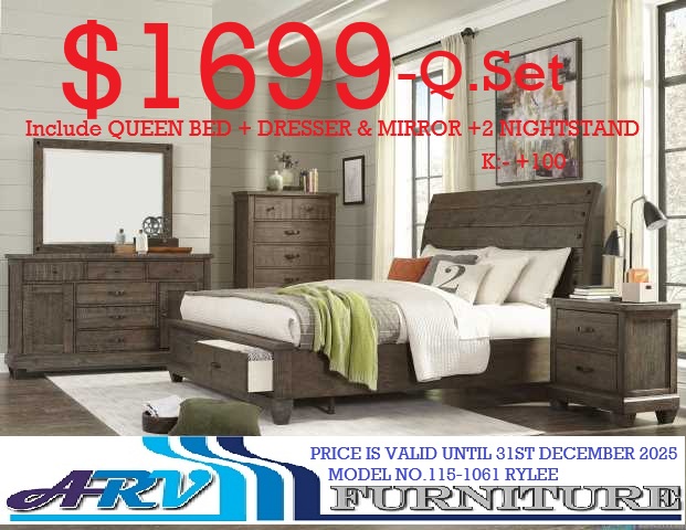 MODEL NO.115-1061-RYLEE The price is for a Queen-size Bed, Dresser , Mirror & 2 Night Tables. Upgrade to a king size for an additional cost of $200. Material Selected solid wood & veneer
