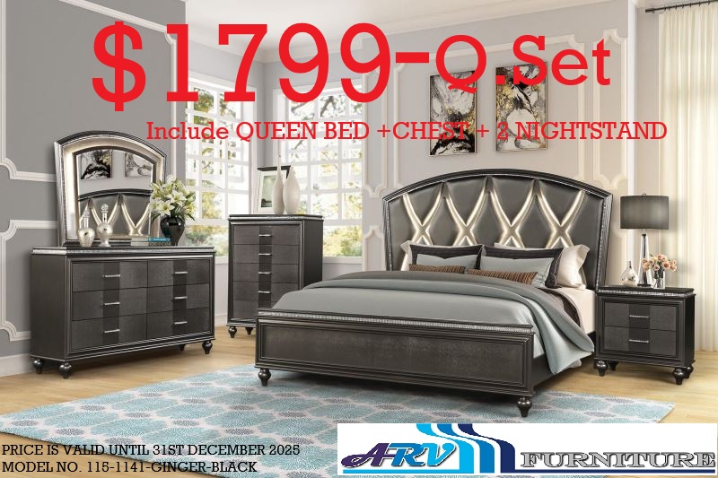 MODEL NO.115-1141-GINGER The price is for a Queen-size Bed, Chest & 2 Night tables. Elevate your bedroom with the Ginger queen Bedroom Set, a complete ensemble that includes a chic bed with LED/PU accents on the headboard, complemented by a matching dresser, mirror, nightstand, and chest. Each piece in this set features a fresh gun metal finish, creating a cohesive and modern look. Designed for both style and functionality, the Ginger Bedroom Set brings a bright and sophisticated ambiance to your bedroom, making it a perfect sanctuary for relaxation.