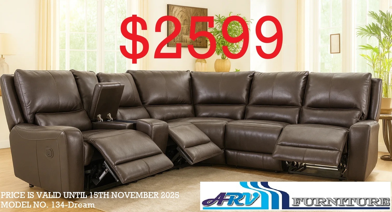 MODEL NO. 134-Dream The price is for a 6 Pcs. Recliner Sectional Sofa. Color:- Light-Brown. The “Dream” name perfectly encapsulates the comfort and relaxation this genuine leather manual sectional aims to provide, making it a perfect centerpiece for a living room or entertainment space. With its luxurious and comfortable seating option generously padded and upholstered in rich, dark brown genuine leather design focuses on ultimate relaxation Featuring three manual reclining seats and an integrated console includes cup holders a convenient spot for beverages, and storage space, perhaps for remotes or other small items. While traditional in its comfort features, the clean lines and contemporary shape of the sectional give it a modern appeal.