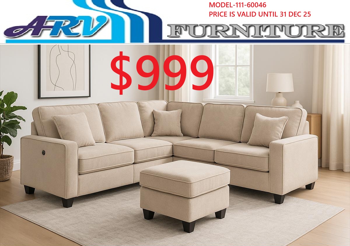 MODEL- 111-60046CAMERON PRICE $999 SECTIONAL WITH OTTOMAN Upgrade your living room with this modern L-shaped sectional, upholstered in Toscana Grey Fabric for a stylish and versatile look. Designed with a built-in USB port for convenient charging and accent pillows, it also includes a matching cocktail ottoman—perfect for extra seating or as a footrest. Spacious, comfortable, and functional, this sectional is ideal for both everyday lounging and entertaining. Specification LAF- W-55″ x D-34″ x H-36″ RAF- W-55″ x D-34″ x H-36″ CORNER-33.5X33.5 INCHES OTTOMAN-25X25X19 INCHES