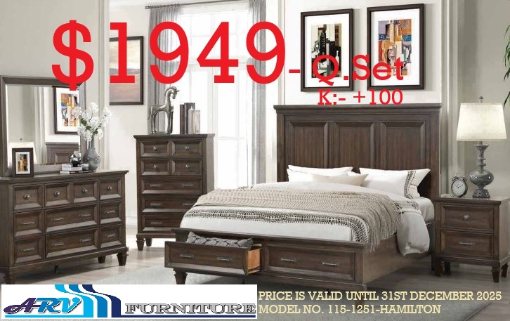 MODEL NO.115-1251-HAMILTON The price is for a Queen-size Bed, Dresser, Mirror, Chest & 2 Night tables. Upgrade to King-size for an additional cost of $200. WALNUT FINISH Transform your bedroom into a haven of comfort and style with the Hamilton Bedroom Set. Featuring a bed with a storage footboard, a dresser, a mirror, nightstand, and chest, all in a luxurious walnut finish, this set offers a complete and cohesive look. The Hamilton Bedroom Set combines practicality with timeless design, creating a space that is both inviting and elegant.