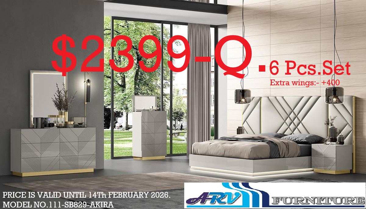 The price is for Queen size Headboard, Footboard, Rail, Dresser, Mirror, & 1 Night table. [6 Pcs. Queen Set] Color:- Grey. Wings available for an additional cost of $400 Key Features: It’s built from solid wood and upholstered in PU material with gold accent; Wings can be added on both sides ; LED light running through the footboard and rails. Four-drawer spacious chest with built-in mirror and jewelry storage. The two drawers nightstand comes with wireless charging feature 6 Drawer Double dresser with LED mirror All the case goods have soft close feature. Box spring is not required as the bed comes with the bed board