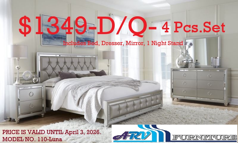 The price is for a Double / Queen-size Bedroom set includes Bed, Dresser, Mirror & 1 Night Stand. The Luna puts a contemporary spin on old-world style. The luxurious silver finish and mirror accents add sleek, ultramodern touches, while a tufted headboard and footboard echo the traditional style of upscale, craftsman-made furniture. Silver.
