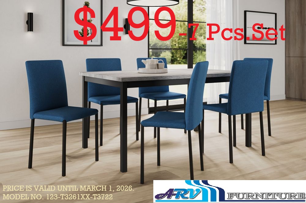 The price is for a Table and 6 Chairs. 7-Pc. Dining Set. Chair Color:- Blue. Redefine dining elegance with our exceptional Dining Set, meticulously crafted to elevate your dining experience with modern flair and lasting style! Here are five key features that make this dining set a standout addition to your home: Modern Two-Tone Table Design with Industrial Flair: Make a statement with our dining table’s modern two-tone design, featuring a light grey finish tabletop paired with grey finish metal legs. This unique combination adds a touch of industrial flair to your dining space, creating a stylish focal point that commands attention. Sturdy and Built to Last: Our dining table is crafted with durability in mind, ensuring it stands the test of time. With sturdy construction and high-quality materials, you can trust that this table will be a long-lasting addition to your home, providing a reliable foundation for countless meals and gatherings. Lightweight and Stylish Dining Chairs: Indulge in comfort and style with our modern dining chairs, meticulously designed to offer a comfortable sitting experience without compromising on aesthetics. Draped in linen fabric, these chairs exude sleek sophistication while remaining lightweight and easy to move around your dining space. Fully Assembled Chairs for Hassle-Free Setup: Say goodbye to complicated assembly with our dining chairs that come fully assembled out of the box. With no assembly required, you can enjoy the convenience of setting up your dining space in minutes, allowing you to focus on creating memorable moments with family and friends. Convenient Packaging for Ample Seating Options: Our dining chairs come conveniently packaged in sets of six per box, ensuring that you have ample seating options available for your dining needs. With enough chairs to accommodate your guests comfortably, you can host gatherings and dinner parties with ease, knowing everyone will have a seat at the table. Elevate your dining space with our exquisite Dining Set, where modern design meets lasting quality for unforgettable dining experiences. Dimensions Dining Table:- 60″W 36″D 30″H Dining Chair:- 18″W 17″D 35″H Material Dining Table- Wood/MDF Metal Dining Chair- Linen Fabric