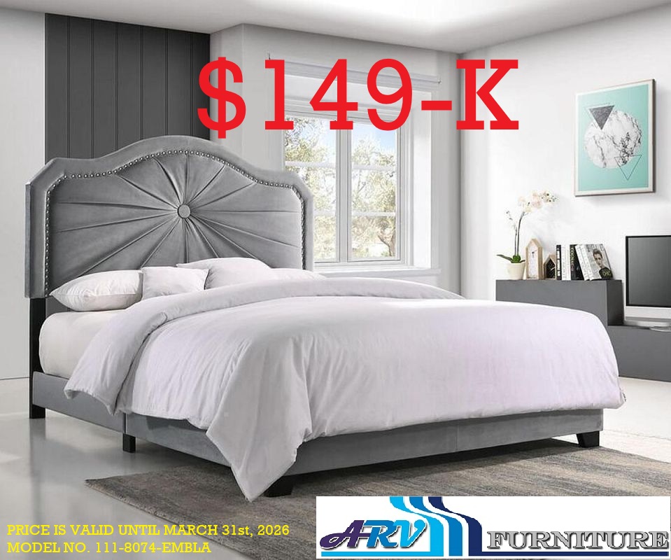 The price is for a Queen-size Bed. Upgrade to a King-size Bed for an additional cost of $100. Color:- Grey. Grey Velvet Covers the Deep Channel Tufted Design with a Black Metal Powder Coated Trim on Headboard Includes Mattress Support. Dimensions King Bed 86″L 85″W 59″H Queen Bed 86″L 65″W 59″H Material Velvet