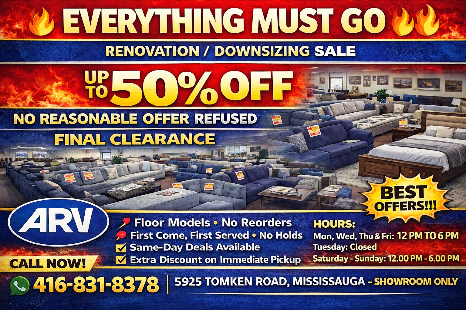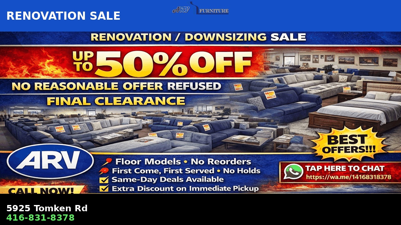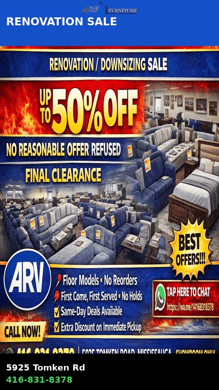 Everything must go! We are clearing out showroom floor models at discounted prices. 🛋️ Sofas, sectionals, beds, dining sets 💰 Up to 50% OFF ⚠ No reasonable offer refused 📍 5925 Tomken Rd, Mississauga 📞 416-831-8378 👉 First-come, first-served – no holds