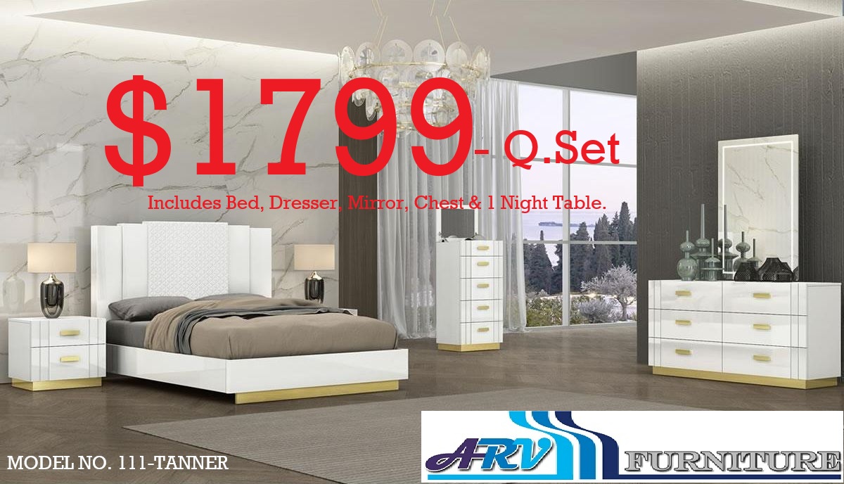The price is for a Queen size Bed, Dresser, Mirror, Chest & 1 Night Stand. [Floor Models Only]. This set is going to bring function and fashion to your bedroom. Key Features: Featuring Solid wood in laquer white finish with PU headboard. Using the titanium gold metal element for bed and case goods Nightstand, Dresser & Chest has soft close feature The 2-drawer nightstand has USB port & wireless charger Chest with built-in mirror and jewelry storage. 6-Drawer Dressing Cabinet horizontally oriented contains two columns of chest of drawers with LED light Mirror at the top.