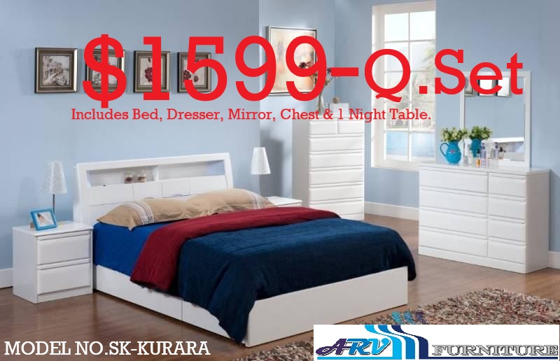 The price is for a Queen size Bed, Dresser, Mirror, Chest & 1 Night Stand. [Floor Models Only]. Headboard with light and power plug and 2 storages with modern design bed. The body has 3 drawers. Enough storage space can help you save more room. Features: : Color: Gloss White. : Bed with 3 drawers. : Lighting switch in bed. Material HIGH GLOSSY MDF WOOD