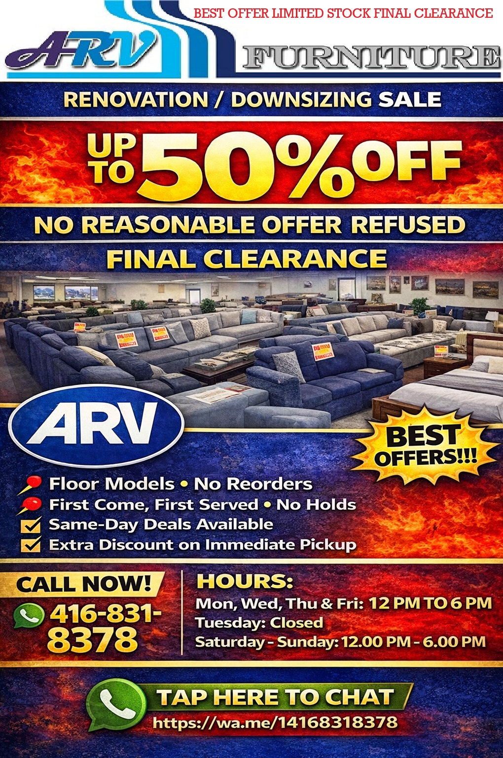 No Reasonable Offer Refused. Make an offer Today. Up to 50% OFF. Extra Discount on Immediate pick up. HURRY!!!!!!!!! https://arvfurniture.com/category.php?category=Clearance