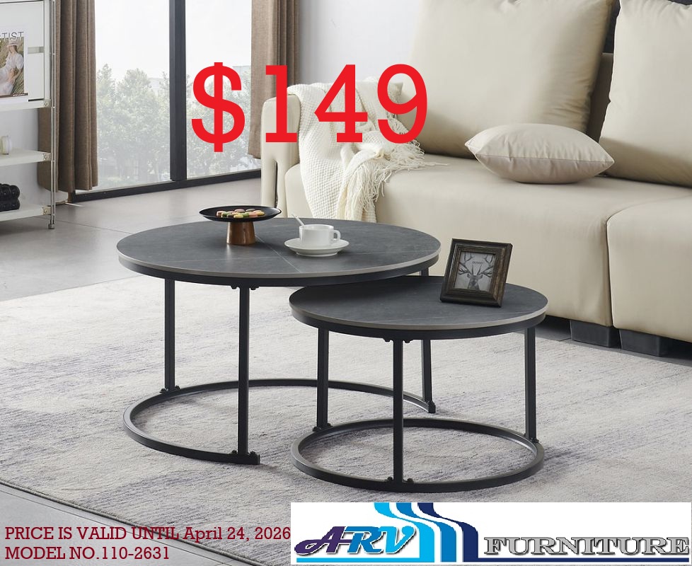 The price is for a Set of 2 Coffee Tables. Set of 2 Coffee Tables Sintered Stone Armani Marble Top With Black Steel Base. Dimensions Big Table: 32″Round 18″H Small Table: 24″Round 15″H