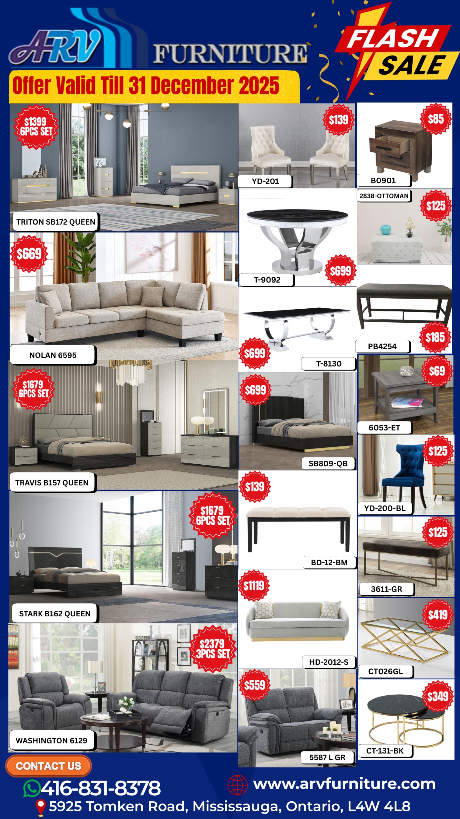Dear viewers, thank you for watching. In this video, we are happy to showcase our special flyer promotion items available for a limited time at ARV Furniture. Each piece has been selected for its quality, durability, and value, and we are offering exclusive discounted prices to help you upgrade your home without overspending. Whether you are looking for a sofa, bedroom set, dining table, recliner, or storage bed, we have many great deals available. Please feel free to visit our showroom at 5925 Tomken Road, Mississauga, or call us for any questions. Your support means a lot to us, and we are committed to providing honest service, high-quality Canadian-made furniture, and excellent after-sales care. Thank you for choosing ARV Furniture.”