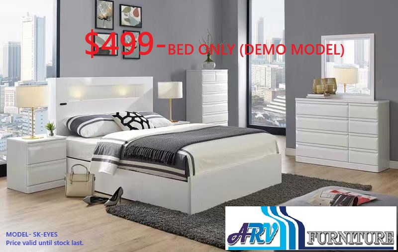 PRICE $499 BED ONLY DEMO MODEL Headboard with light and power plug, and 2 storage units with a modern design bed. The body has 3 drawers. Enough storage space can help you save more space. Features: : Color: Gloss White. : Bed with 3 drawers. : Lighting switch in bed.