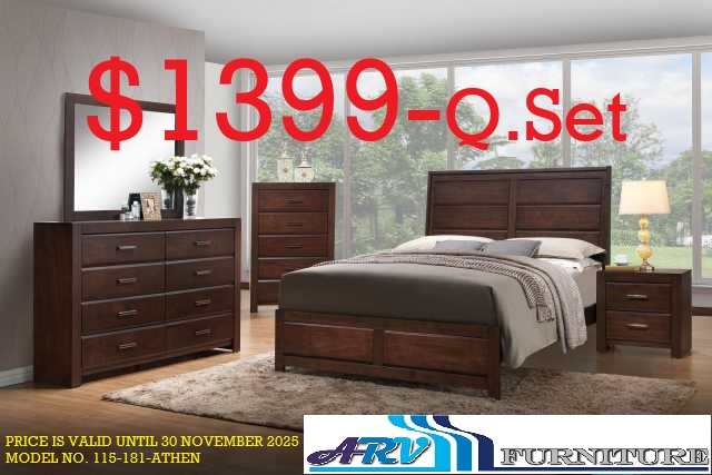 MODEL NO.115-181-ATHEN The price is for a Queen-size Bed, Dresser, Mirror, Chest & 2 Night tables. Dimensions Queen Bed – 63 55 87 King Bed – 78 55 87 Dresser – 59 34 14.5 Mirror – 41.5 34 2 Chest – 31.5 48.5 16 Night stand – 23.5 24 16 Material Selected solid wood & veneer