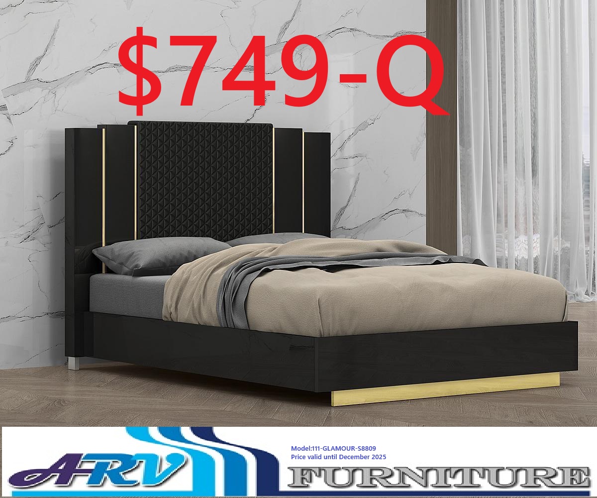 Description The price of $849 is for a Queen-size Bed. This Bed is going to bring function and fashion to your bedroom. Featuring Solid wood in a lacquer Black finish with a PU headboard. Using the titanium gold metal element for bed and case goods Queen Bed: 60″W x 52″H x 80″ Color: Black/Gold