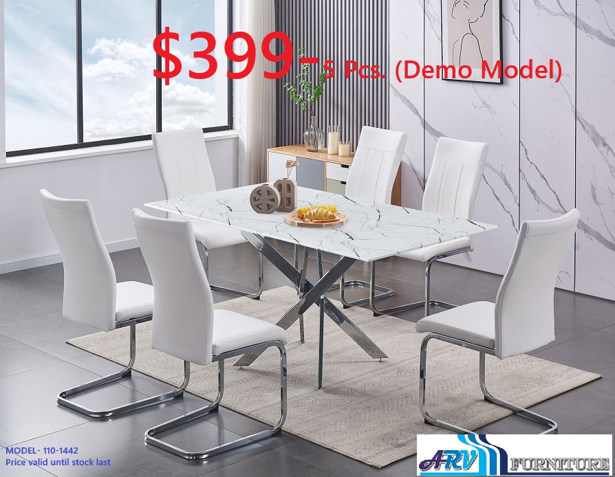 Regular Price $799 Price $399 Description The price is for a Table & 4 Chairs.(DEMO MODEL) 5 Pcs Dinette Set Description Table: 10mm Tempered White Marble Glass with Chrome Legs Chairs: White PU Cushion Seats with Chrome Legs Dimensions Table: 63”L 36”W 30”H Chairs: 23″L 17″W 40″H