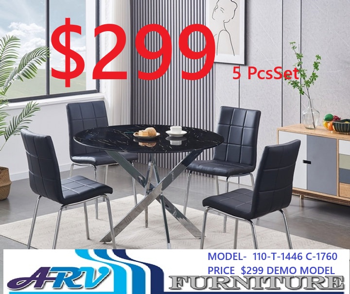 PRICE $299 DEMO MODEL Description Table: 10mm Tempered Black Marble Glass with Chrome Legs Chairs: Black PU Cushion Seats with Chrome Legs Dimensions Table: 44”L 44”W 30”H Chairs: 21″L 18″W 35″H