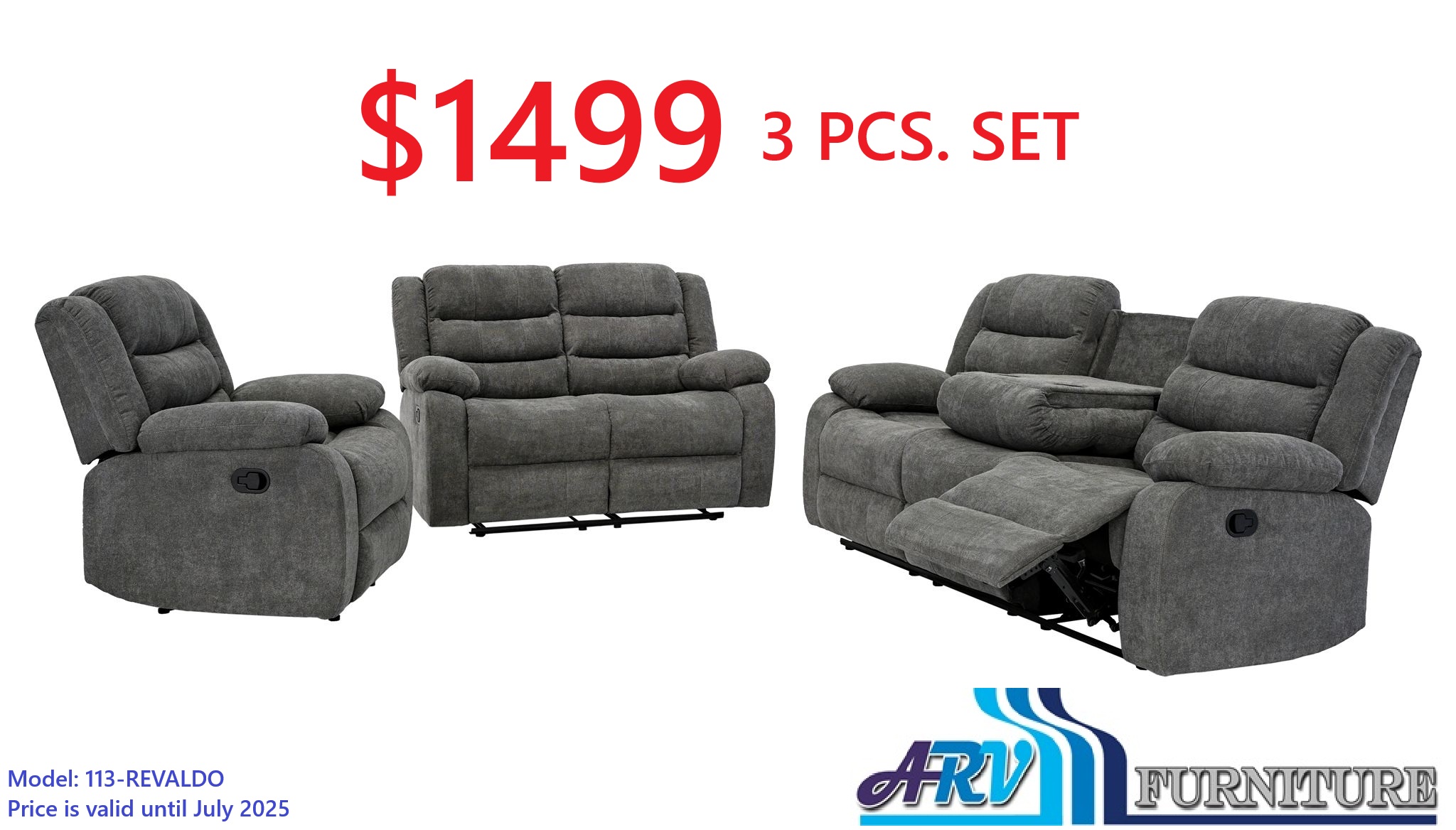 The Price of $1499 is for a Recliner Sofa, a Loveseat, and a Chair. A sofa consists of a Console. Material: Fabric Color: Grey