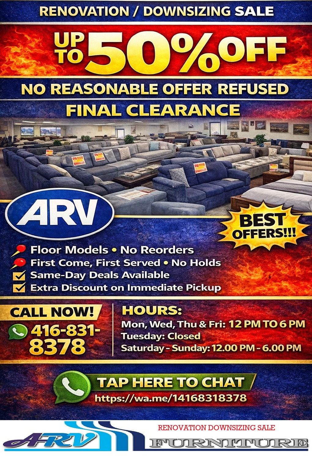 RENOVATION DOWNSIZING SALE ARV FURNITURE MISSISSAUAGA ONTARIO CANADA